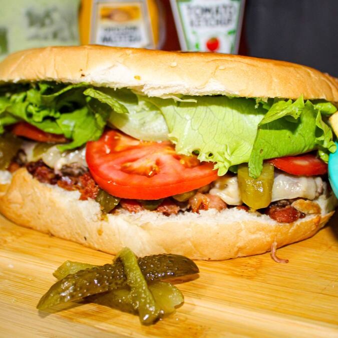 Hambúrguer caseiro, bacon crocante, picles, mussarela derretida, alface americano e tomate, no pão de hambúrguer.