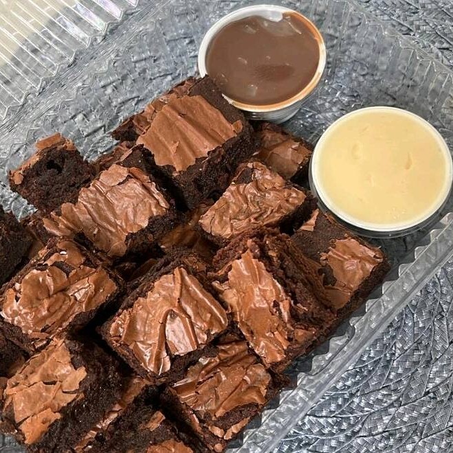 Brownie maravilhoso acompanha brigadeiro de Ninho e brigadeiro cremoso.Sao 130gr de Brownie e 50g de cada brigadeiro