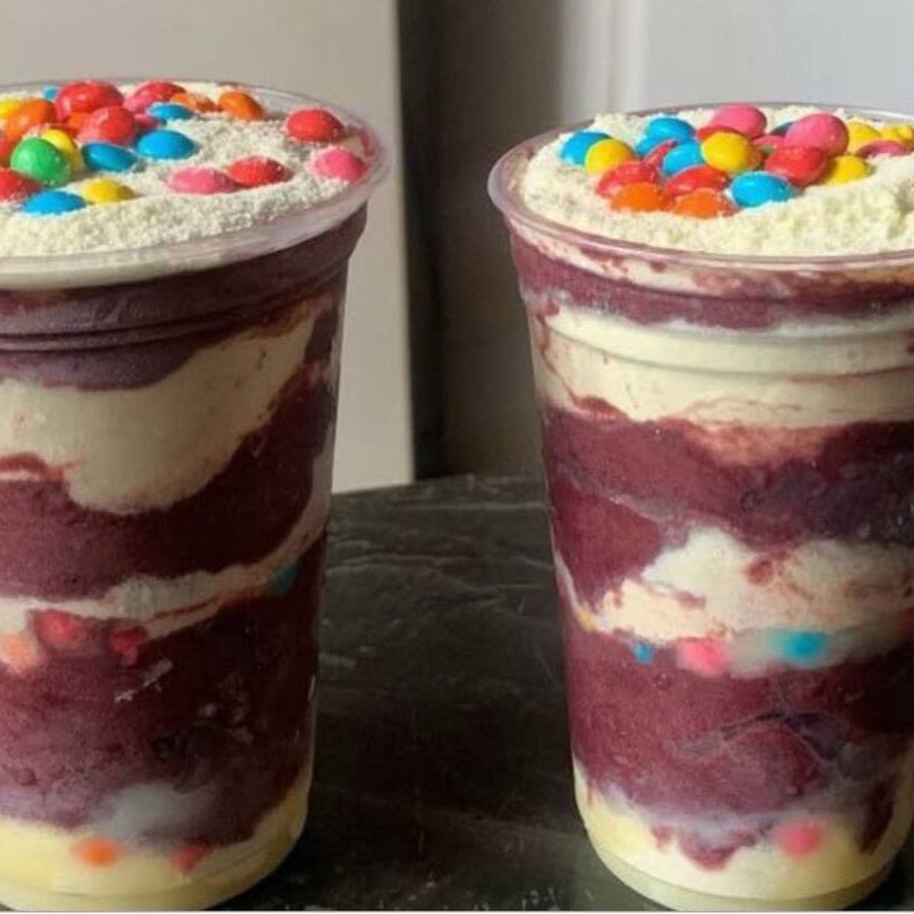 2x açaís iguais de 300 ml ,mousse de leite em pó ,leite em pó e confetti .*Não trocamos os adicionais ,apenas retiramos .