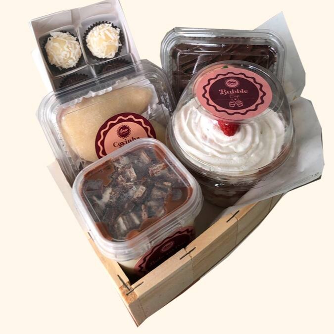 Contém: 1 Bubble Cup ou Bolo no Pote, 1 caixinha com 16 docinhos gourmet, 1 brownie & 1 coxinha gourmet.