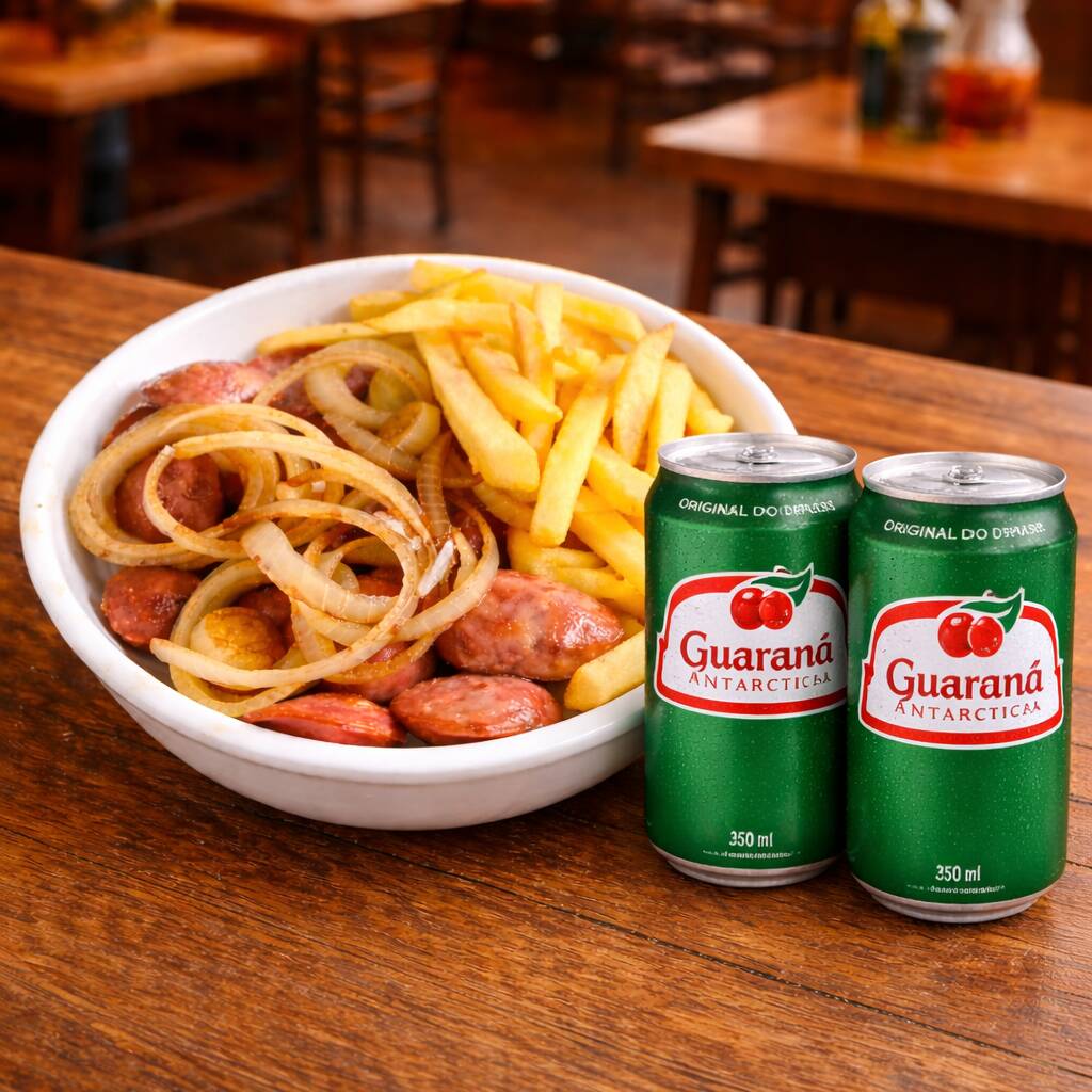 Porção De Calabresa Acebolada Com Batata E Coca 220ml Zero