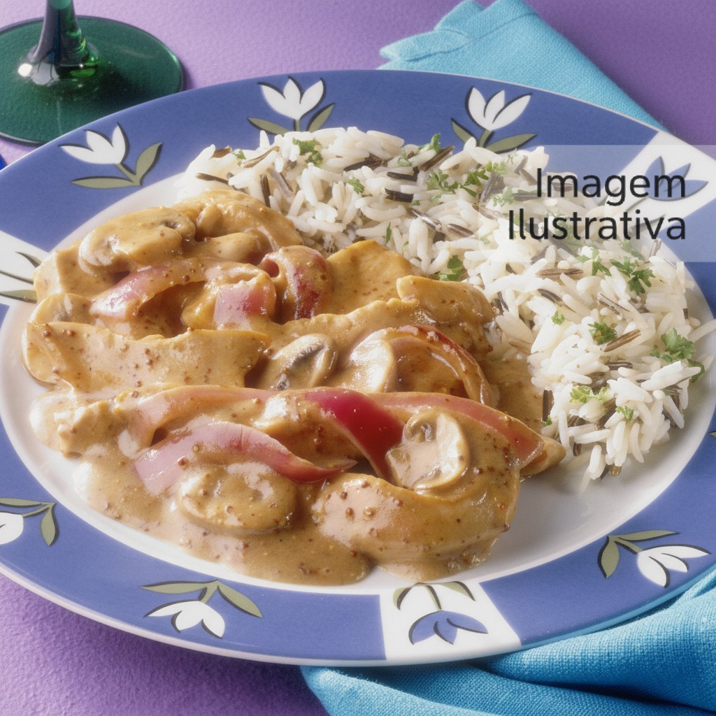 Strogonoff de frango, arroz branco e batata frita e salada do dia