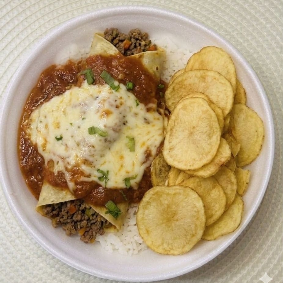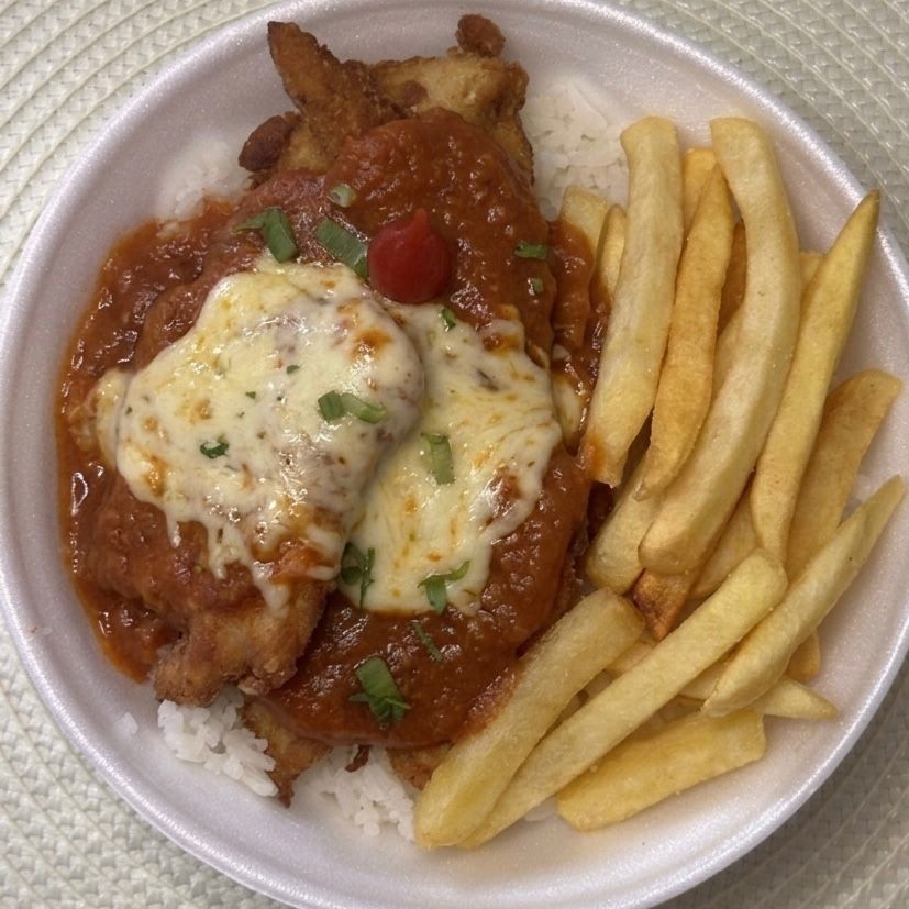 Acompanha arroz branco batata frita e filé d frango a Parmegiana c delicioso molho caseiro