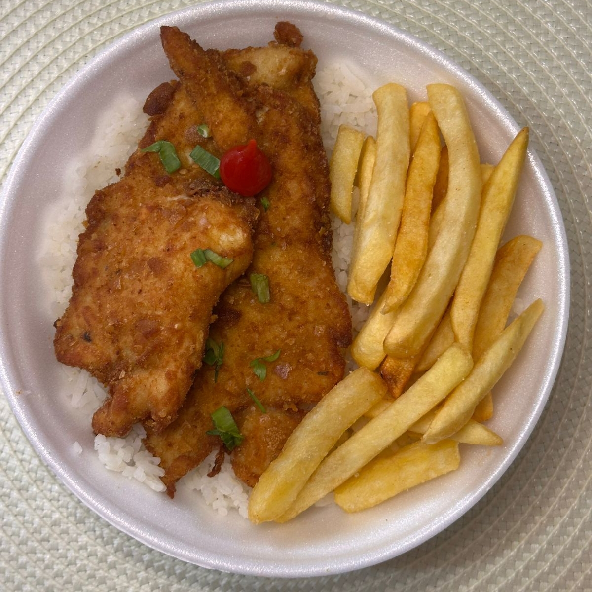 Arroz,feijão,batata frita, filé d frango empanado e salada do dia