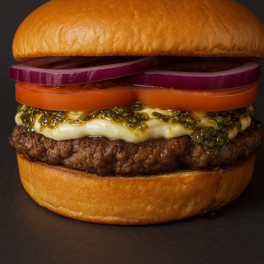 Pão, burger 150gr, requeijão cremoso, tomate, cebola roxa, chimichurri da casa e maionese.