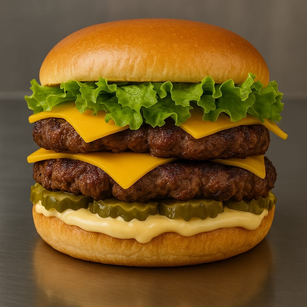 Pão, 02 burgers de 150gr, dupla camada de cheddar fatiado, molho especial, alface, picles, e maionese.