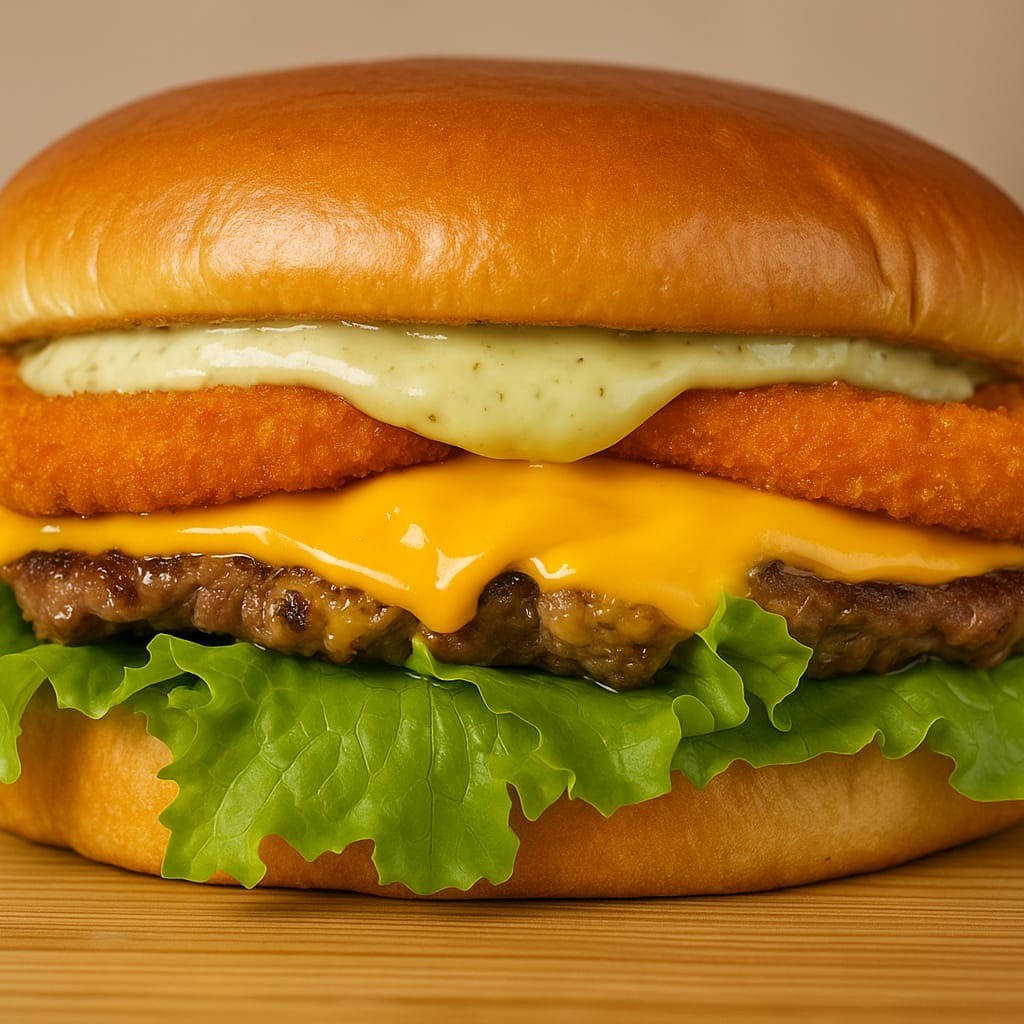 Pão, burger 100gr, cheddar cremoso, onion rings, alface e maionese.