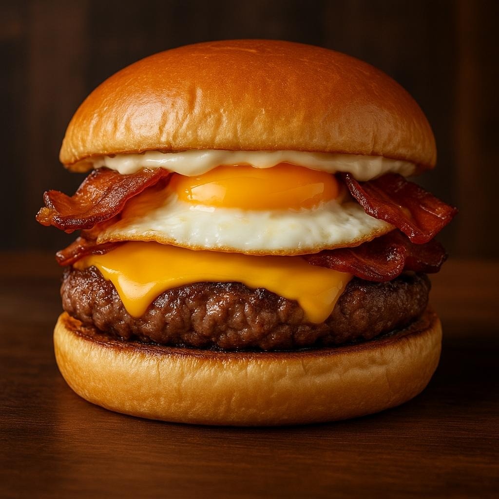 Pão, burger 150gr, cheddar fatiado, ovo, bacon fatiado e maionese.