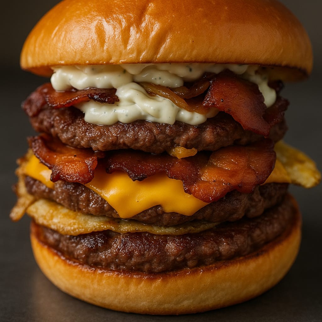 Pão, 03 burgers de 100gr, ovo, dupla camada de bacon fatiado, cheddar fatiado, requeijão cremoso e maionese.