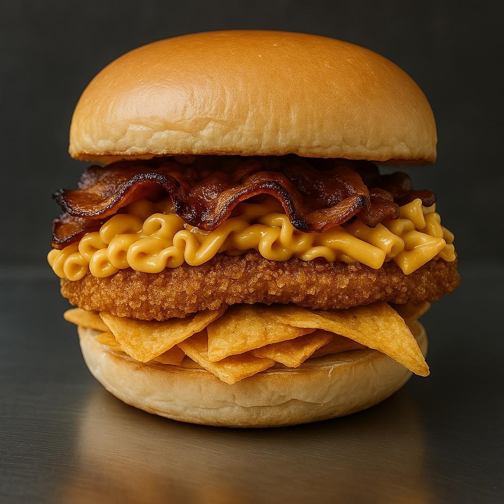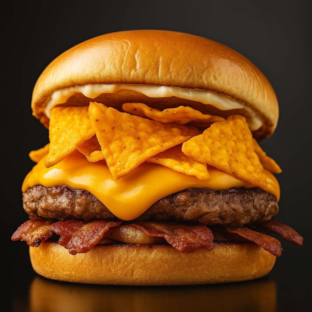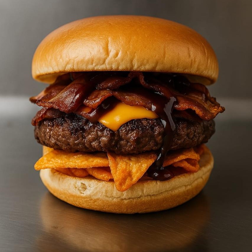 Pão, burger 100gr, cheddar cremoso, bacon fatiado, Doritos e maionese.