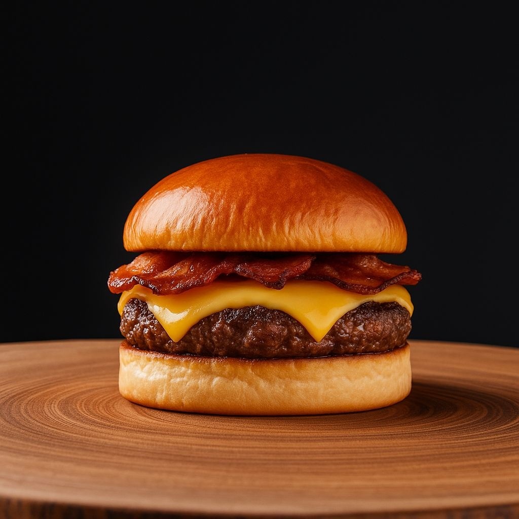 Pão, 2 Burguers de 100gr, Cheddar Fatiado, Bacon Fatiado, Bacon Cubos, Picles e Maionese.