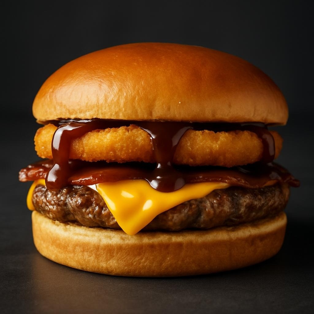 Pão, burger 150gr, cheddar fatiado, bacon fatiado, onion rings, barbecue e maionese.
