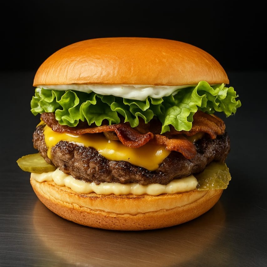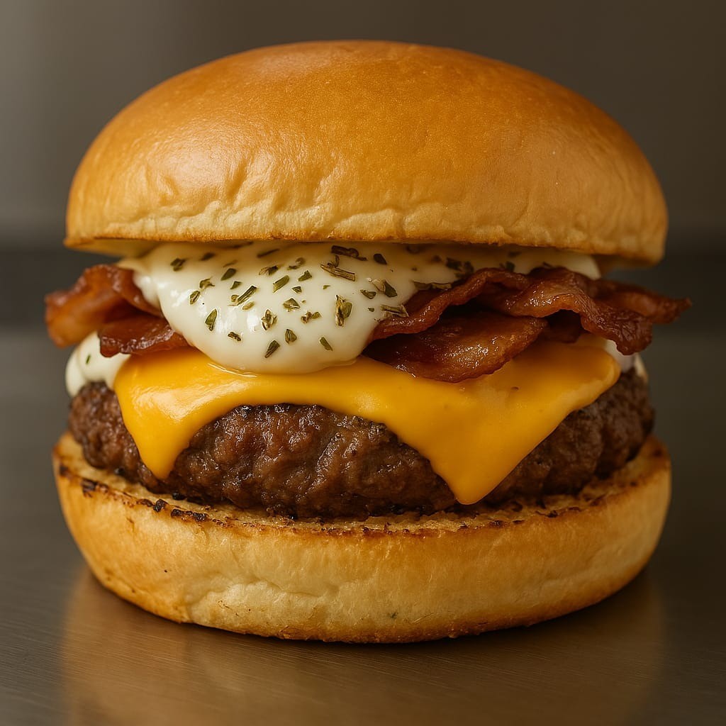 Pão, burger 150gr, cheddar fatiado, requeijão cremoso, bacon fatiado e maionese.