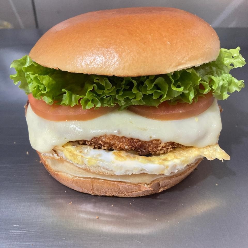 Pão, filé de frango empanado, mussarela, ovo, alface, tomate e maionese.