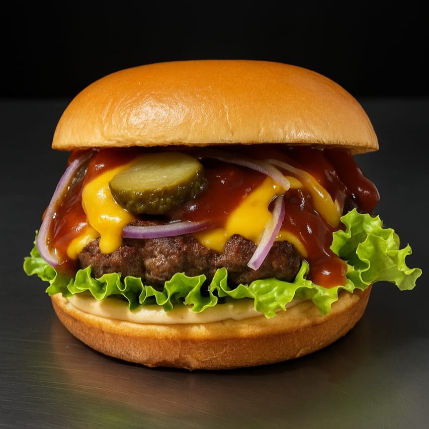 Pão, 02 burgers 100gr, cheddar cremoso, mussarela, bacon fatiado, barbecue e maionese.