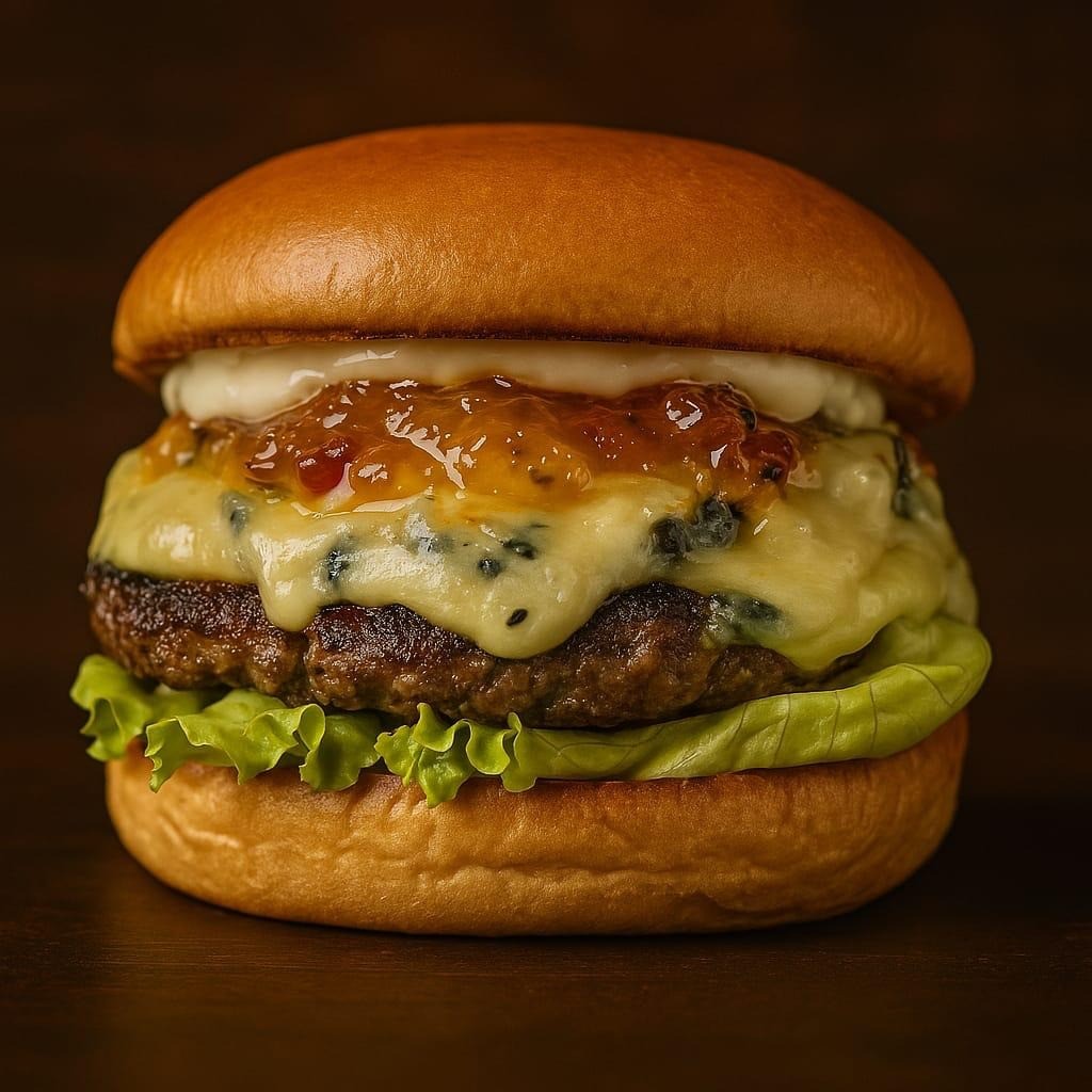 Pão, Burger 150gr, Gorgonzola, Geleia de Pimenta Doce, Alface, Maionese.