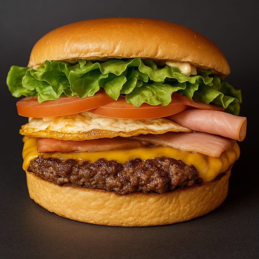 Pão, burger 100gr, alface, tomate, ovo, mussarela, presunto e molho especial.