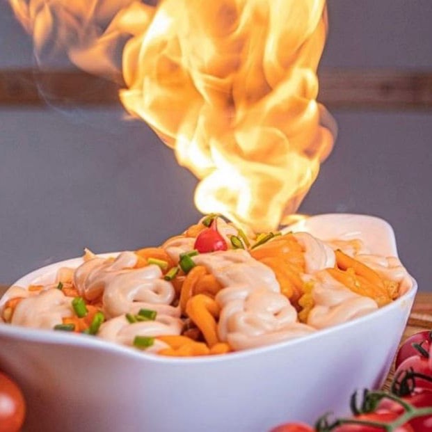 Calabresa Acebolada Flambada Na Cachaça Com Tomate E Cebola E Mussarela