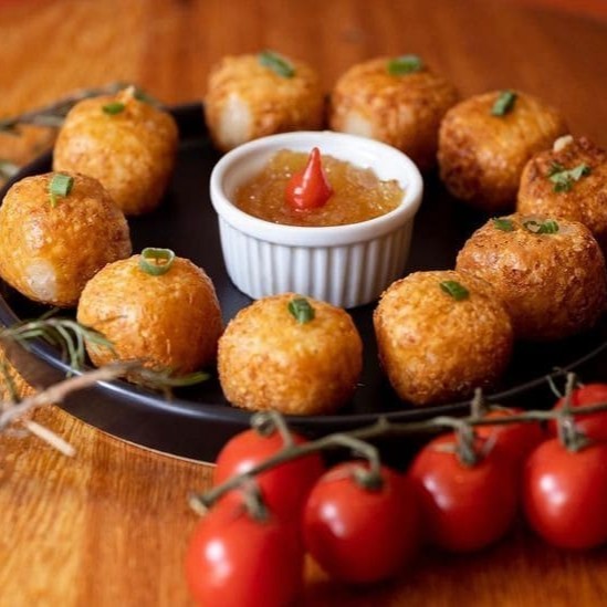 Inhoque Frito Recheado Com Linguiça De Pernil E Mussarela , Acompanha Geleia De Abacaxi Agridoce