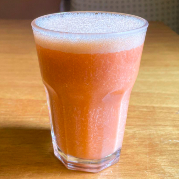 Suco de laranja batido com morangos inteiros congelados. 300ml