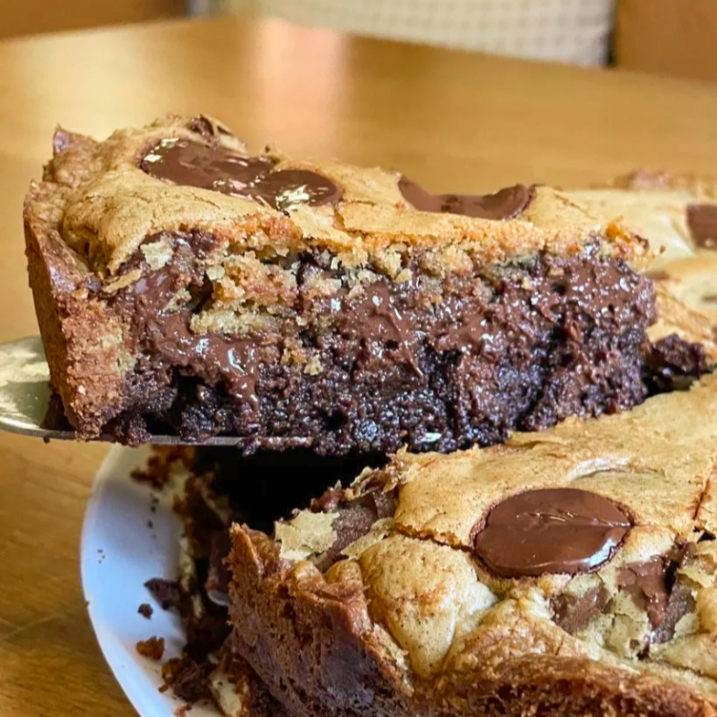Fatia da nossa torta meio a meio: metade brownie de chocolate meio amargo e metade cookie tradicional com gotas de chocolate. Uma combinação irresistível!