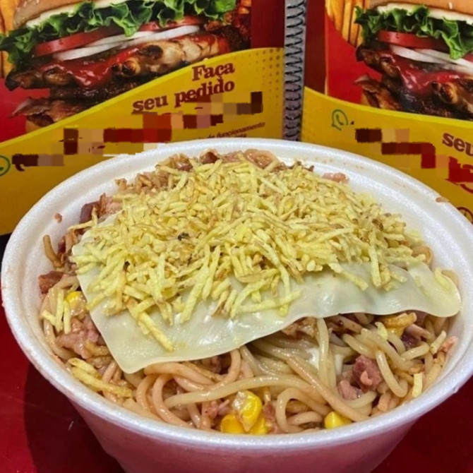 400g somente de macarrão, bacon, mussarela, presunto, barbecue, milho e batata palha.