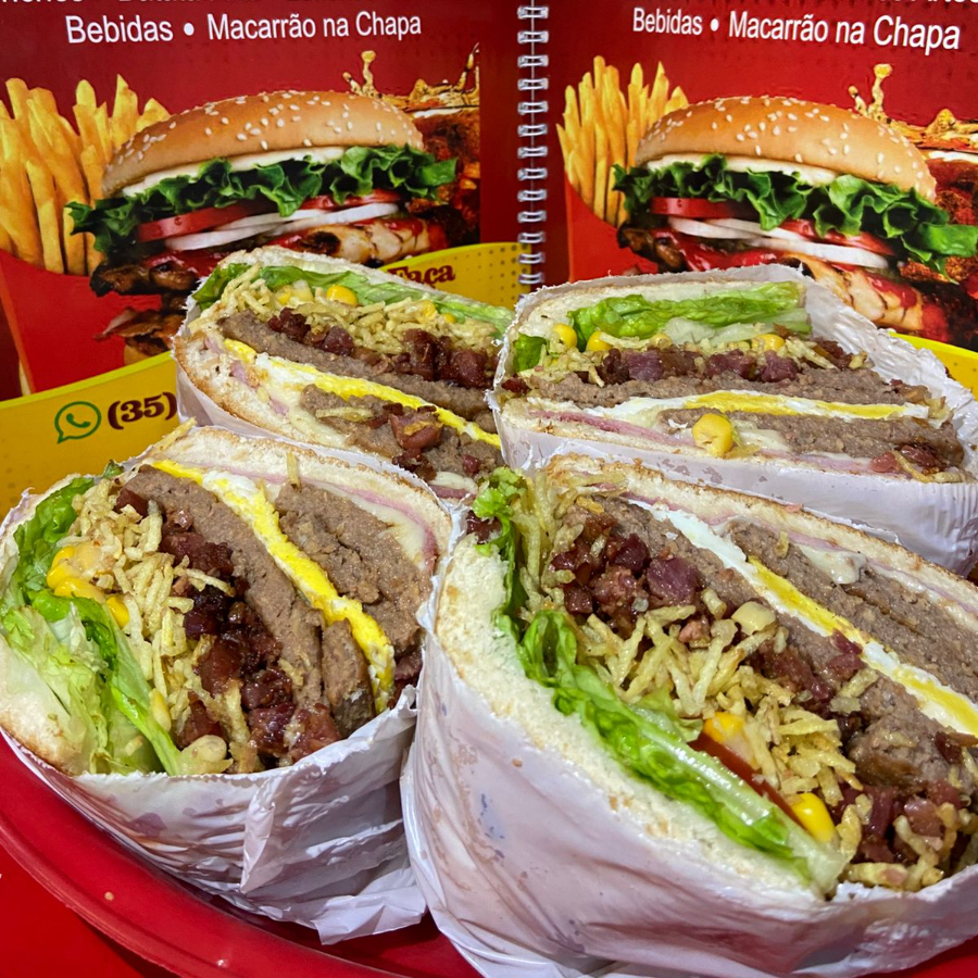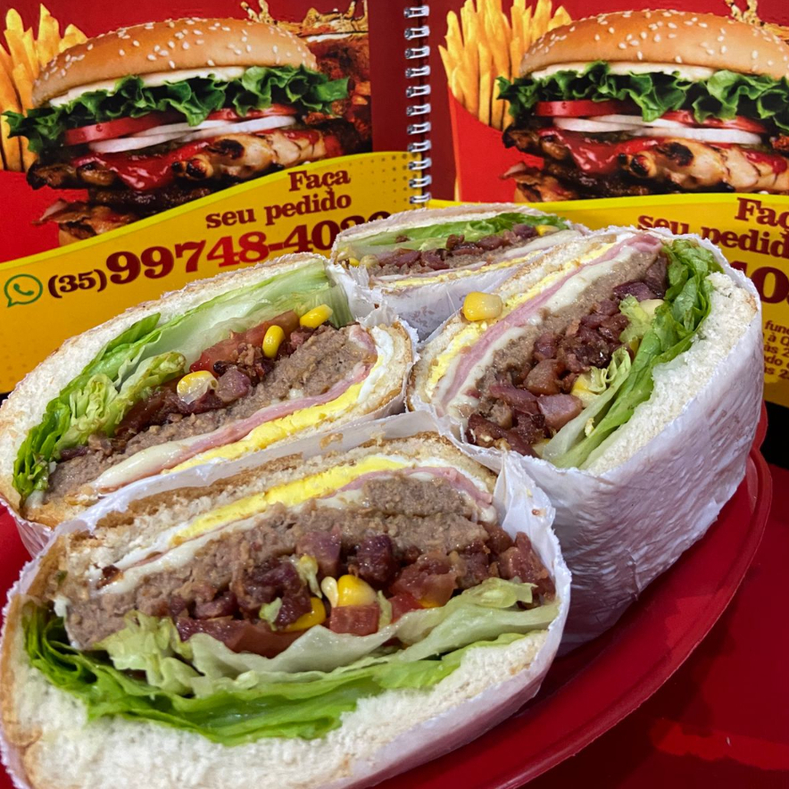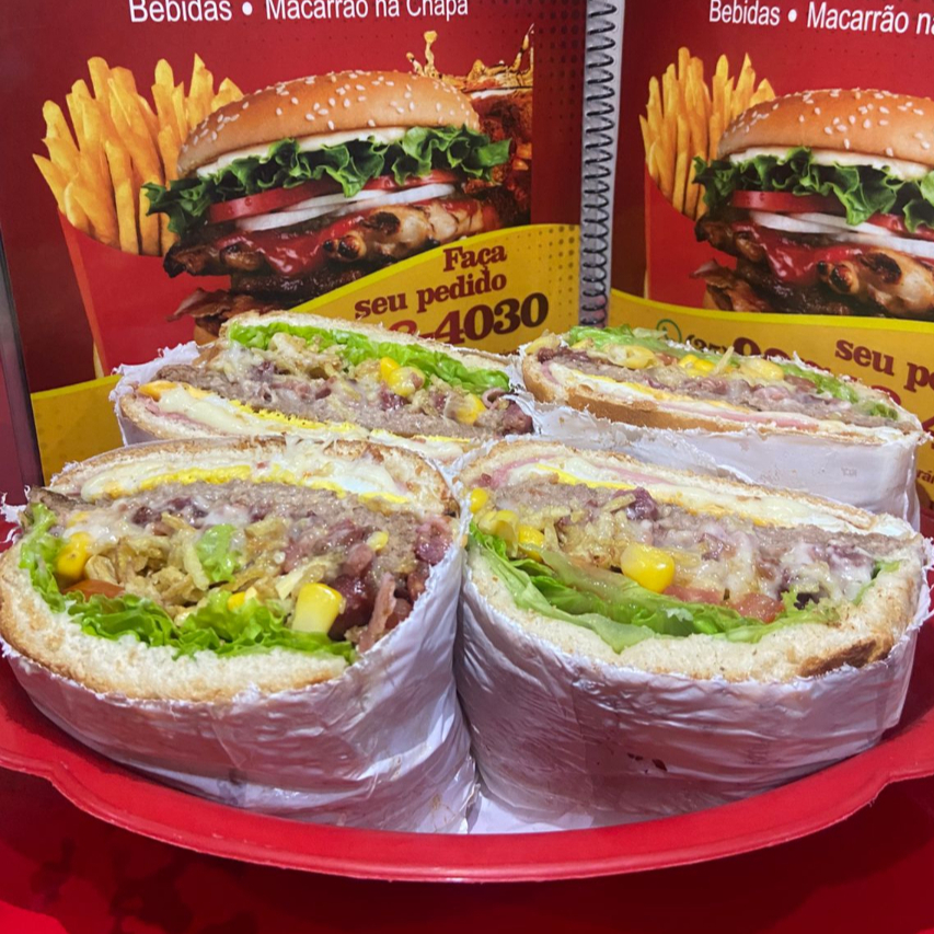 Pão de hambúrguer, 4 hambúrgueres no grande, 2 hambúrgueres no pequeno, bacon, alface, tomate, milho, batata palha, ovo frito, presunto e mussarela.