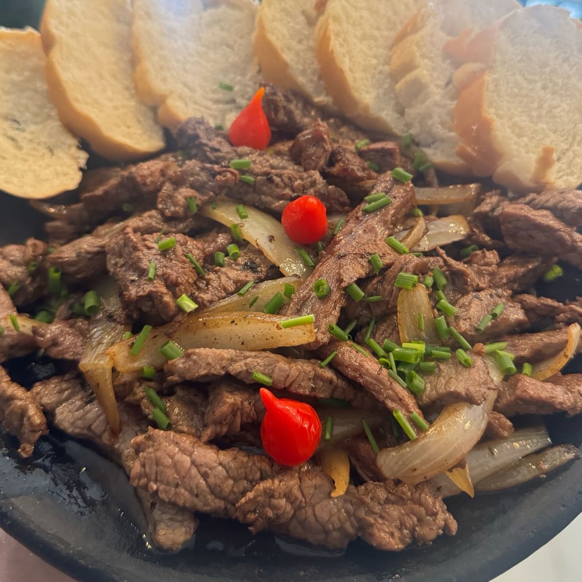 Delicioso executivo de alcatra acebolada em tiras, acompanha arroz, feijão, batata frita e salada.