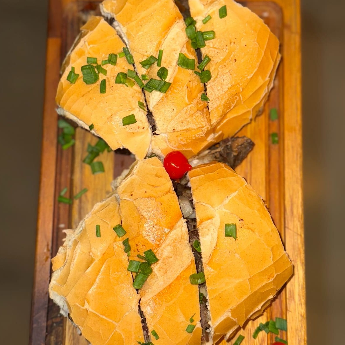 Delicioso sanduiche feito de pão frances recheado com alcatra acebolada, queijo mussarela e vinagrete. 500g