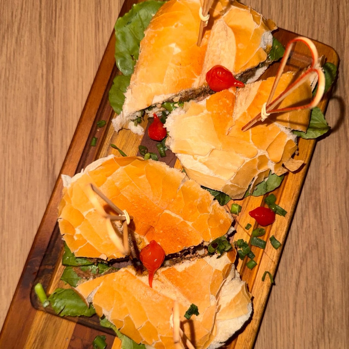 Delicioso sanduiche feito de pão frances recheado com picanha fatiada, queijo mussarela e vinagrete. 500g