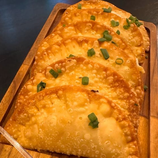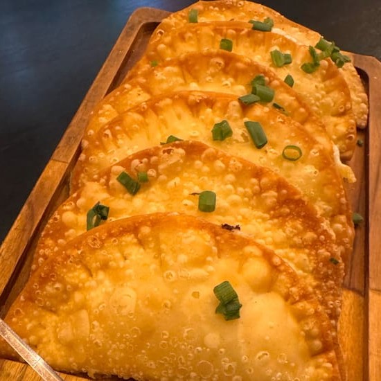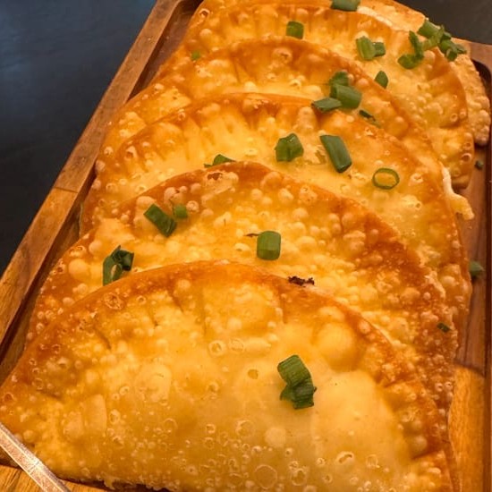 Pastel com recheio de queijo mussarela, parmesão e gorgonzola, acompanha vinagrete (6unidades)