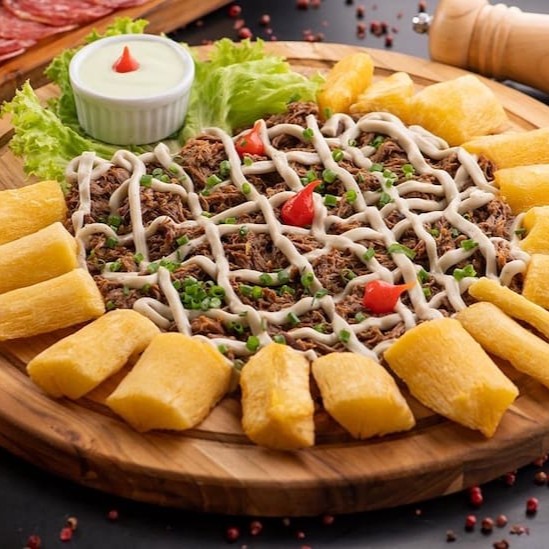 Deliciosa costela bovina desfiada ao molho gorgonzola acompanhada de mandioca frita 700g