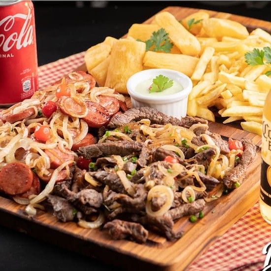 Tábua tamanho família, contém linguiça de porco, alcatra acebolada, batata frita e polenta frita 1,5kg