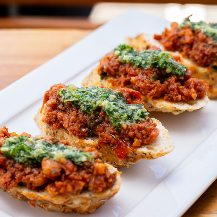 Ragu de linguiça de pernil, servido em fatias de pão italiano com molho pesto de ervas frescas.