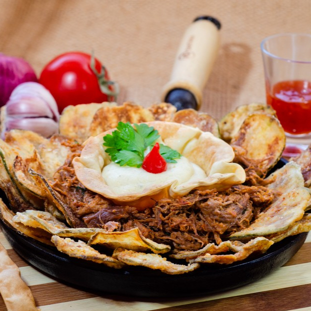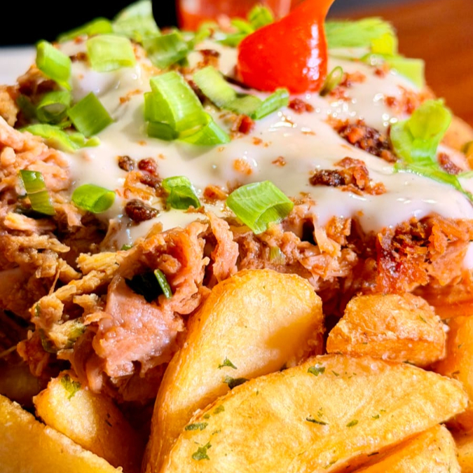 200g de pernil suíno desfiado, servido com creme de alho, farofa de bacon e cheiro-verde, sobre 400g de batata rústica.