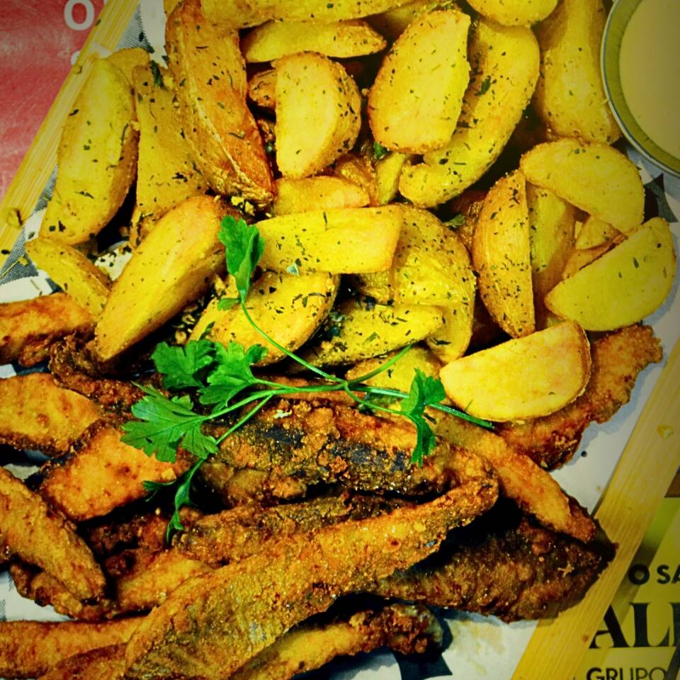 400g in natura, filé de tilápia empanado e frito, servido com 400g de batata rústica, temperado com ervas finas e servido com molho tártaro.