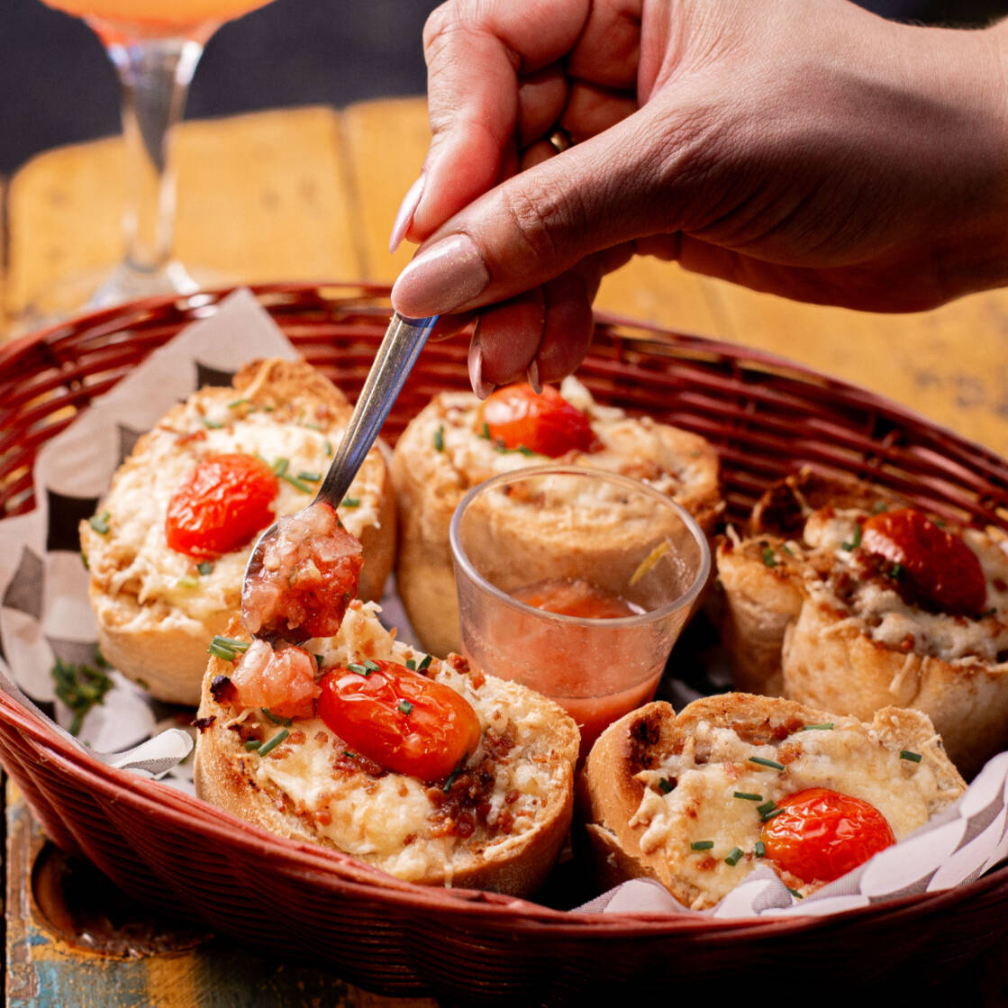 6un. lanche de pernil suíno desfiado, creme de alho, queijo provolone, farofa de bacon e tomate cereja gratinado, servido com vinagrete de cachaça.