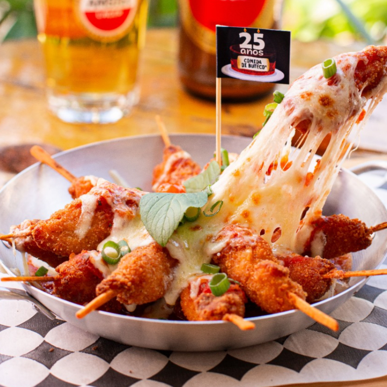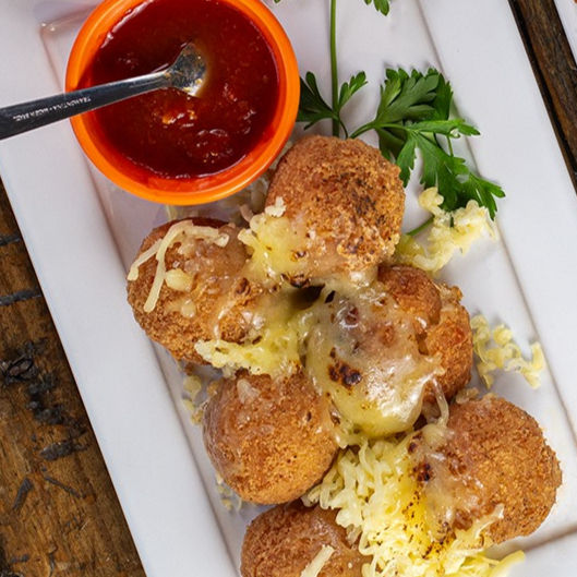 6 unidades de bolinho de risoto de suã na cachaça, recheado de queijo canastra, empanado e frito, servido com molho pomodoro.