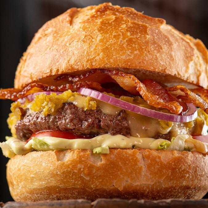 Burger, Bacon, Queijo Prato, Alface Americana, Tomate, Cebola Roxa, Pimenta Jalapeño e Maionese Especial