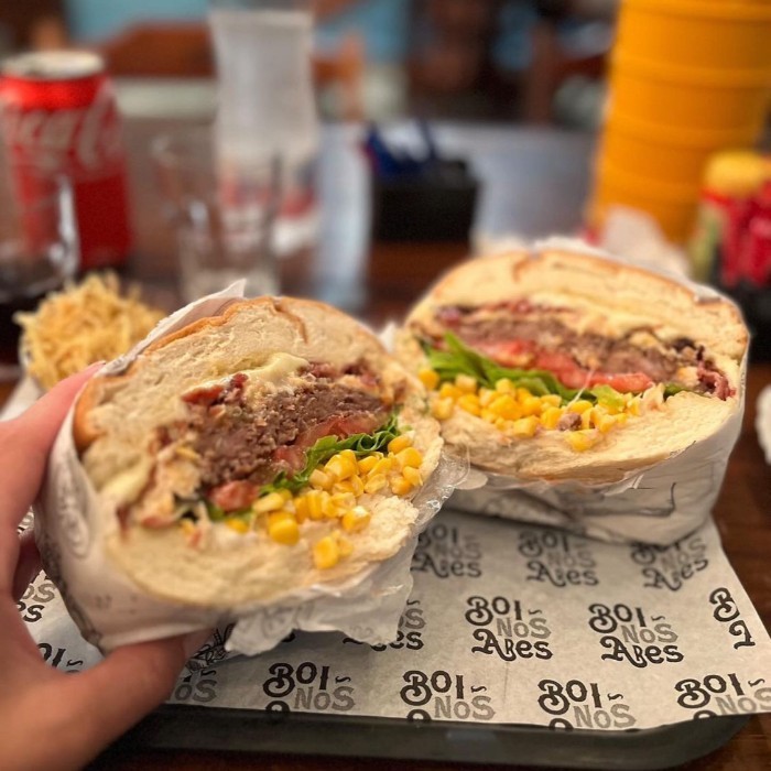 Pão brioche, hambúrguer artesanal, queijo tipo catupiry da casa, queijo mussarela, bacon, alface, tomate, milho verde e maionese da casa.