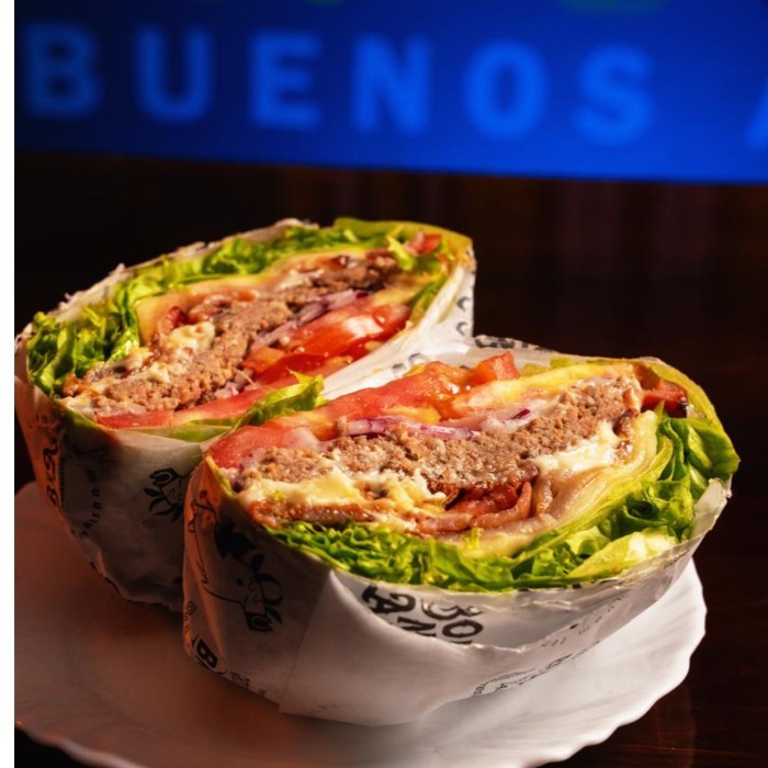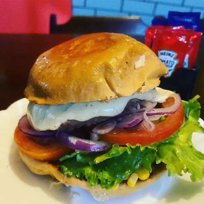 Pão brioche, hambúrguer de soja, queijo mozarela, catupiry, salada completa (alface, tomate, milho e cebola)