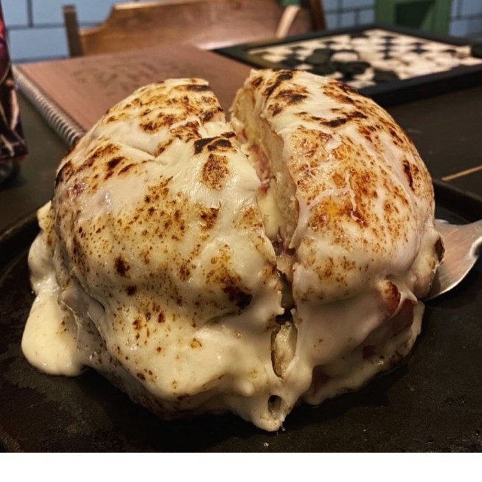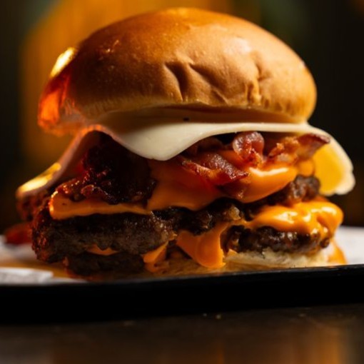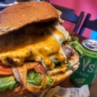 Pão brioche, hambúrguer artesanal (200g), bacon, queijo tipo catupiry da casa, queijo provolone defumado, tomate, maionese da casa, coberto com queijos mussarela e parmesão.
