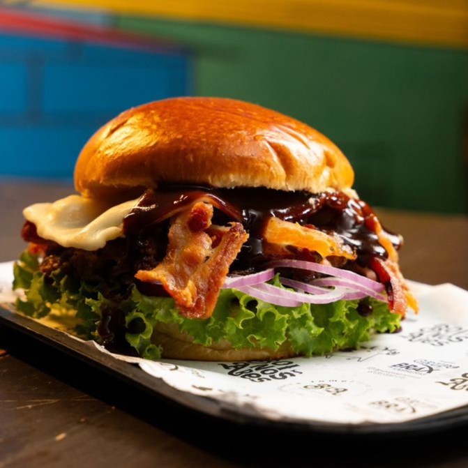 Pão brioche, hambúrguer artesanal, queijo mussarela, bacon, cebola, molho barbecue da casa, alface, tomate e maionese da casa.