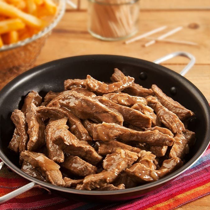 300 gr in natura de tiras de filé mignon com tomates e cebolas. Acompanha 300gr in natura de batata frita palito. Atenção não alteramos itens. os pratos em viagem não mantém a mesma qualidade e crocância no restaurante * imagens ilustrativas