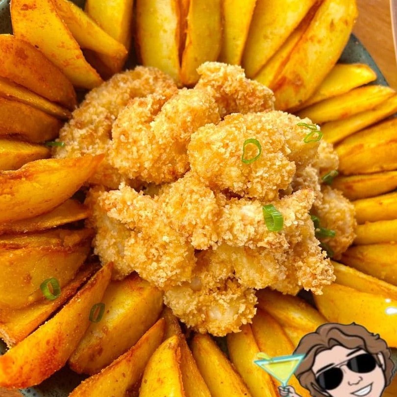 16 Camarões rosa selecionados, marinados com tempero da casa e empanado na farinha panko. Aprox. 300gr in natura Batatas frita rústica manteiga alecrim acompanhado de 02 opções de molho. Atenção não alteramos itens. os pratos em viagem não mantém a mesma qualidade e crocância no restaurante * imagens ilustrativas