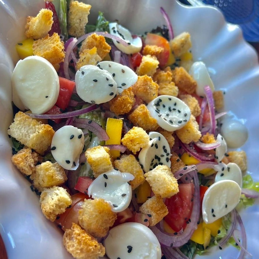 Mix de alface , rúcula, manga, croutons, mussarela de bufala , tomates, cebola roxa e morango. Atenção não alteramos itens. os pratos em viagem não mantém a mesma qualidade e crocância no restaurante * imagens ilustrativas