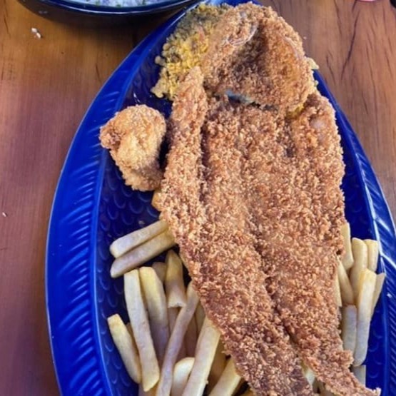 Traíra inteira espalmada empanada e frita, acompanha arroz branco, farofa de maracujá, fritas e frutas da estação. Serve 2 pessoas.