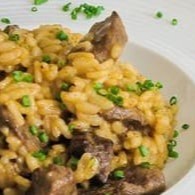 Arroz arbóreo com queijo parmesão, acompanhado com tiras de filé mignon flambados no conhaque. Individual Atenção não alteramos itens. os pratos em viagem não mantém a mesma qualidade e crocância no restaurante * imagens ilustrativas