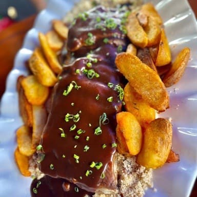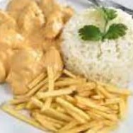 Arroz branco, fritas e strogonoff de frango. Atenção não alteramos itens. os pratos em viagem não mantém a mesma qualidade e crocância no restaurante * imagens ilustrativas