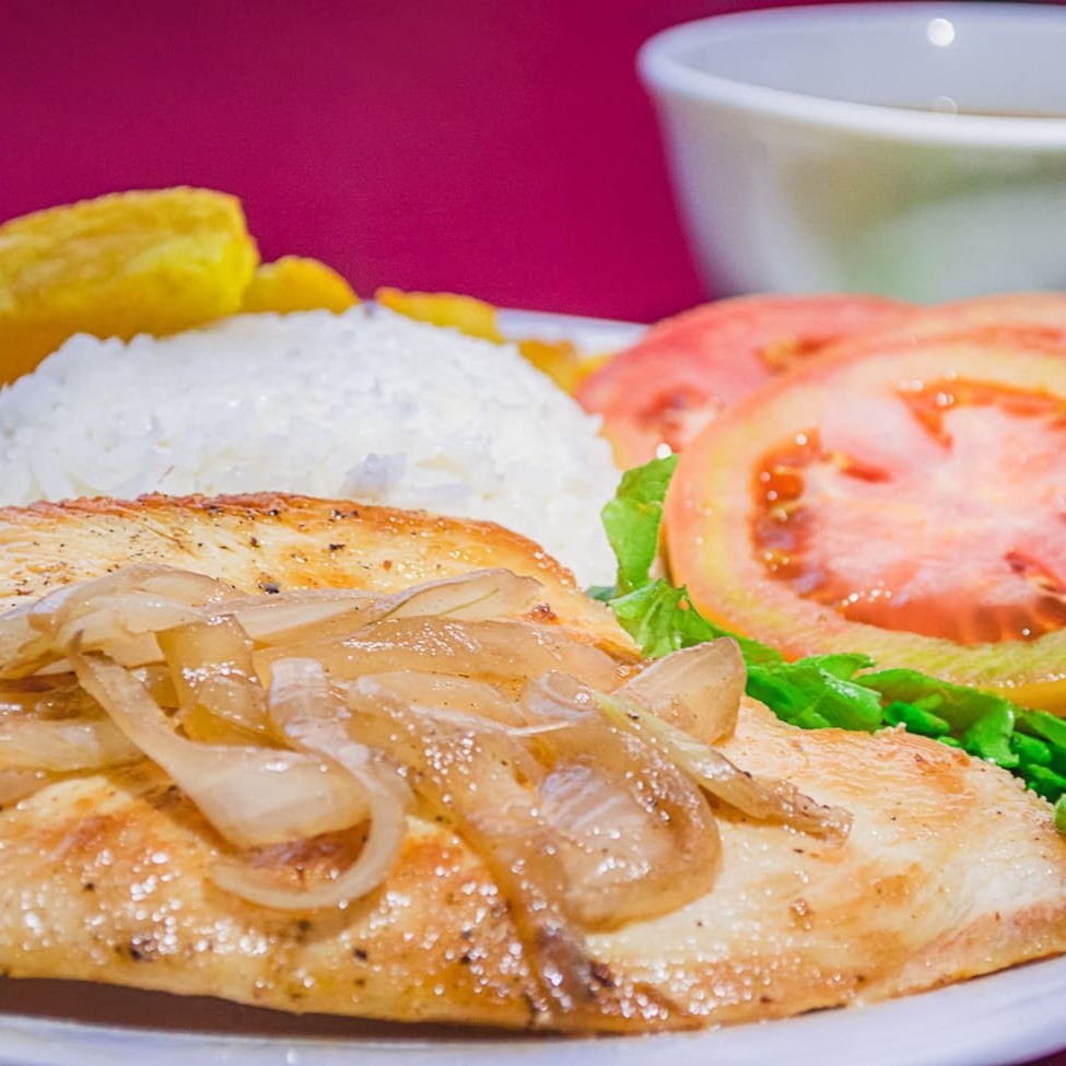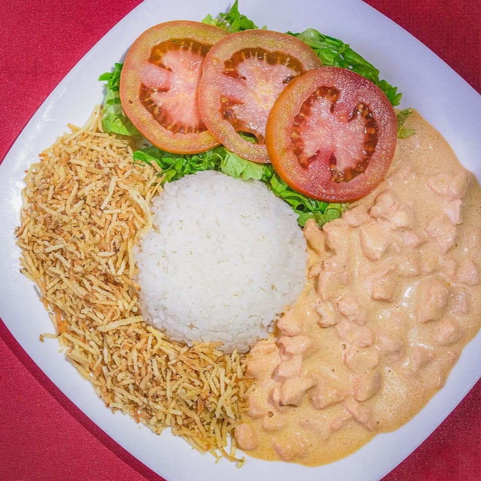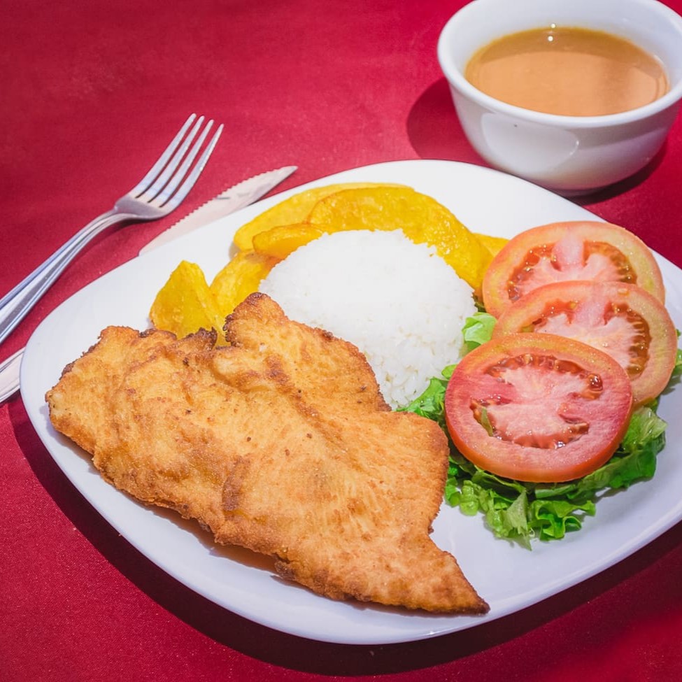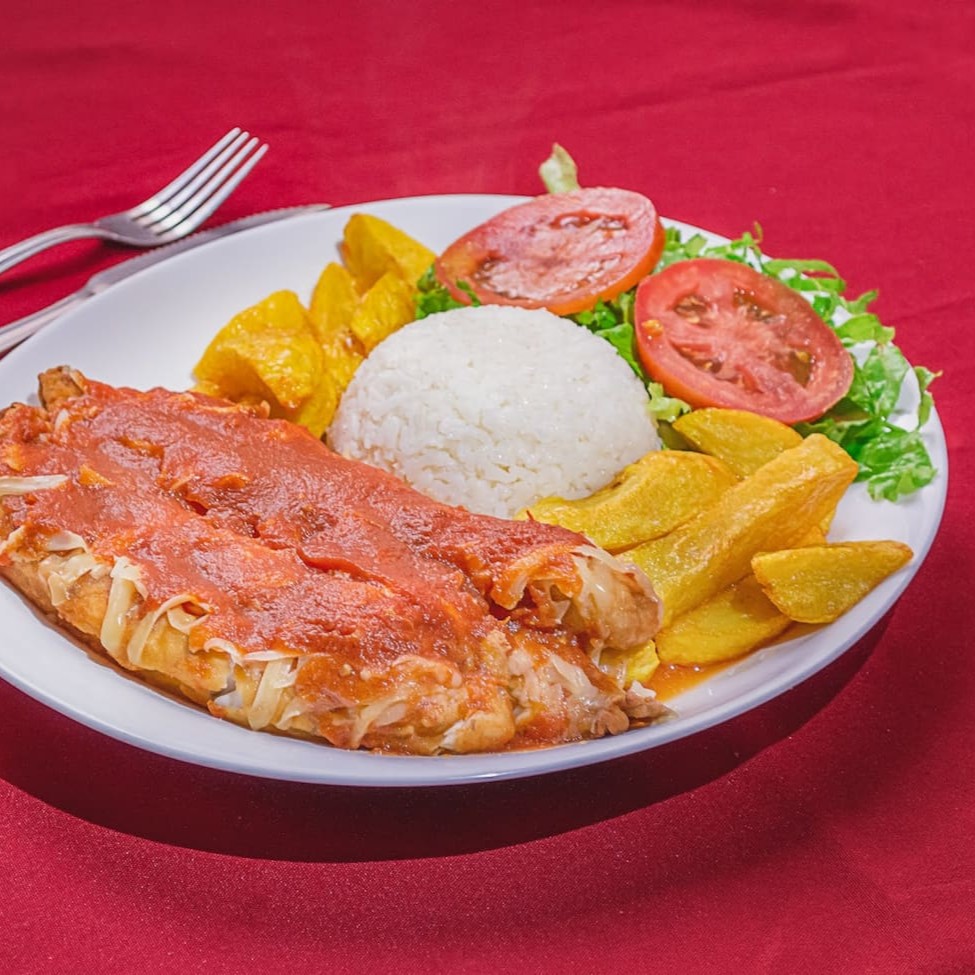 Parmegiana com carne a sua escolha, arroz e fritas.